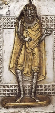 Se trata de una pequeña escena en uno de los lados de un relicario de madera recubierto de plata y que data del siglo XI (hacia 1063, fecha del traslado de las reliquias de San Isidoro de Sevilla a León), conservado en el tesoro de la basílica colegiata real de San Isidro en León (allí en donde el Cid desposa a doña Jimena diez años más tarde). Ese reliario fue pillado por las tropas del Mariscal Soult en 1808, su oro y piedras preciosas desaparecieron entonces. En el interior, una tela mozárabe que se supone era el manto del rey de Sevilla Al Mutadid. Seis escenas del Génesis (además de un rey barbudo de aspecto carolingio) son representadas sobre tablas de plata cincelada, repujadas y grabadas; en la parte delantera del relicario, vemos, la escena (aquí abajo), la expulsión del Paraíso por Dios alado, y el rey carolingio.