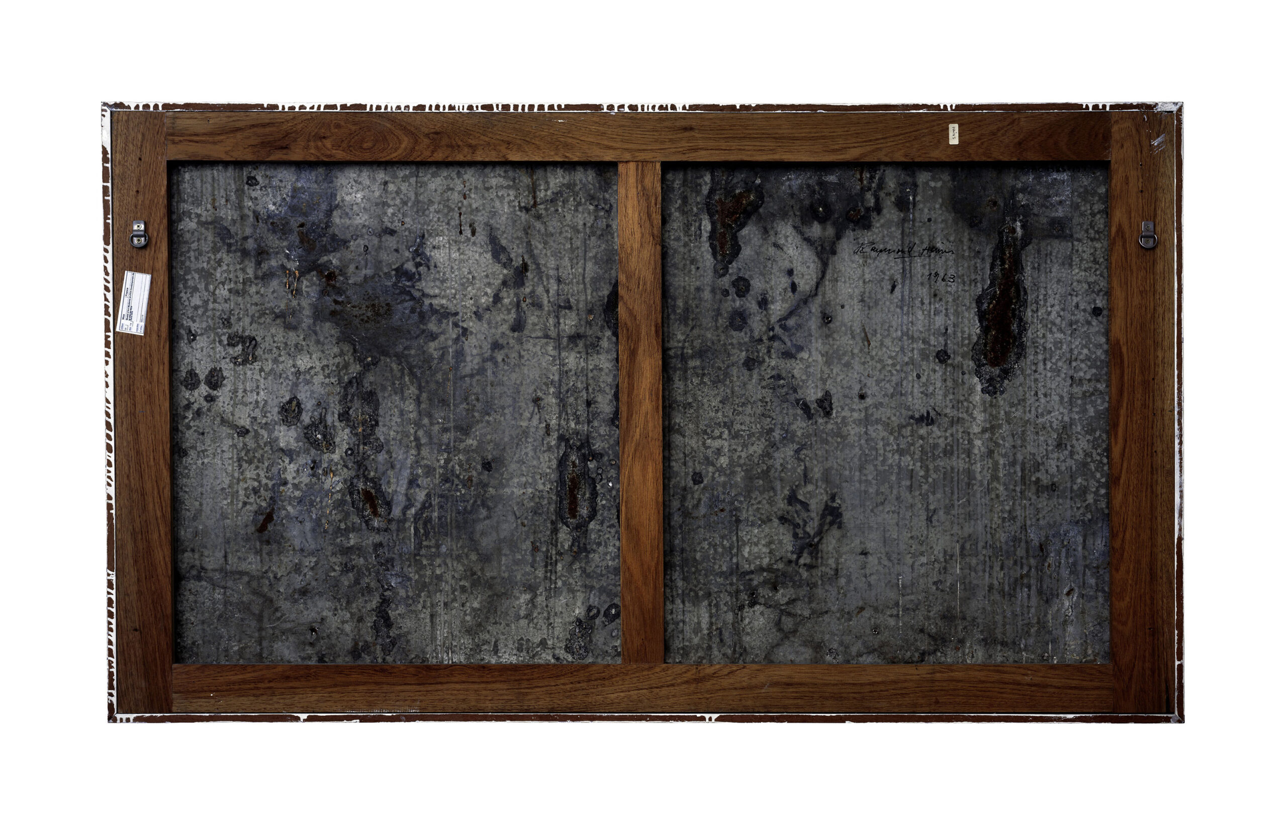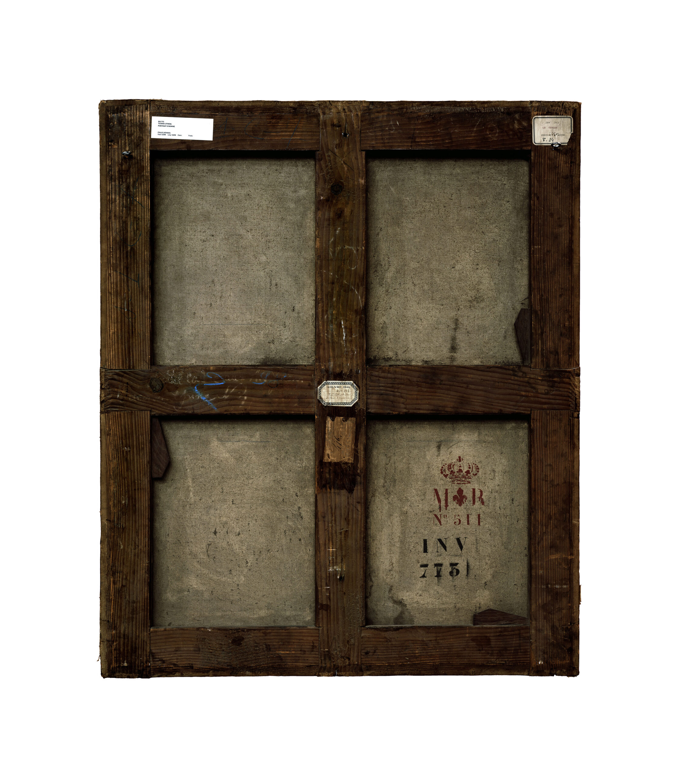 Lo que Philippe Gronon muestra en su exposición en la galería Maubert (hasta el 4 de abril) es, como de costumbre, el reverso de las cosas, aquello que no vemos de entrada, aquello, que si no está escondido, en todo caso no se ve de inmediato. Se trata, claro, del reverso de los cuadros: aquellos en los que no aparece sino un monograma (un Tiziano) y aquellos en los que la profusión de etiquetas cuenta su recorrido (un Monet, aquí abajo). La vida escondida de lo lienzos, itinerarios, afiliaciones, museos, colecciones, transportadores, marquistas, la historia en contrarrelieve. A veces se ven chorreones de pintura que se salieron del anverso. Y, ante todo, la materialidad del cuadro, su existencia de objeto, la invención. (sin fotografía del reverso de Cornelis Gisbrecht...). La serie más reciente nos muestra grandes mantas para transporte de cuadros, desenrolladas y reproducidas con escáner: el detalle revela entrelazados de color, es como si una vida secreta apareciera ante los ojos.